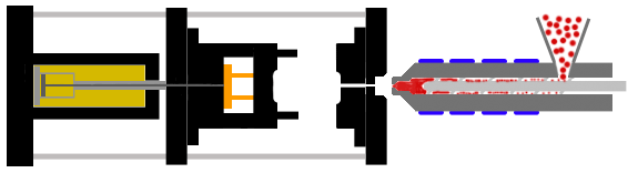 La machine se compose aussi d'une unité appelée d'injection (en gris ci-dessous) qui contient plusieurs corps de chauffe pour contrôler la température de fusion du plastique (en bleu), une vis sans fin qui permet un dosage précis de la quantité de matière à injecter dans la cavité et d'homogénéiser la matière (mélange du colorant et de la charge avec la matière de base), une trémie qui est la réserve de matière de la machine et d'un "piston" (souvent la vis fais office de piston) qui permet d'injecter la matière plastique dans l'empreinte du moule. Les éjecteurs en orange permettent eux d'éjecter la/les pièce(s) finies.